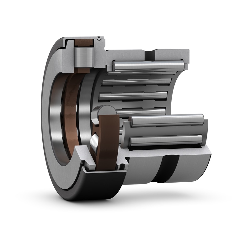 These bearings consist of a radial needle roller bearing combined with a cylindrical roller thrust bearing. Together they can accommodate both radial loads and axial loads in one direction. Their low cross-sectional height makes the bearings particularly suitable for applications where other types of locating bearing arrangements occupy too much space. The thrust part is capped with a cover that forms a gap-type seal to retain the grease in the bearings.