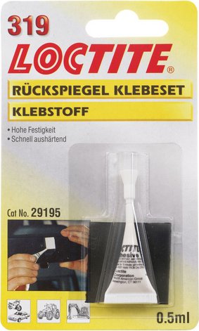 Speciální sada Loctite 319 pro lepení držáku zpětného zrcátka z kovu na sklo. Vyrovnává různou tepelnou roztažnost a proto se také doporučuje pro lepení kovových páček a závěsů u otočných okének. Sada pro lepení zpětného zrcátka je také ideální pro montáž telefonní a rádiové antény na sklo nebo jiné spoje kov / sklo.