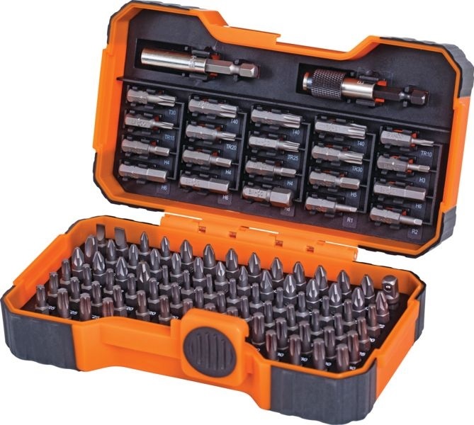 Sada 100 ks bitů na šrouby s rovnou drážkou, drážkami Phillips, Pozidriv, vnitřním šestihranem, drážkou Robertson a barevné na šrouby s drážkou TORX®, TORX® s pojistným kolíkem