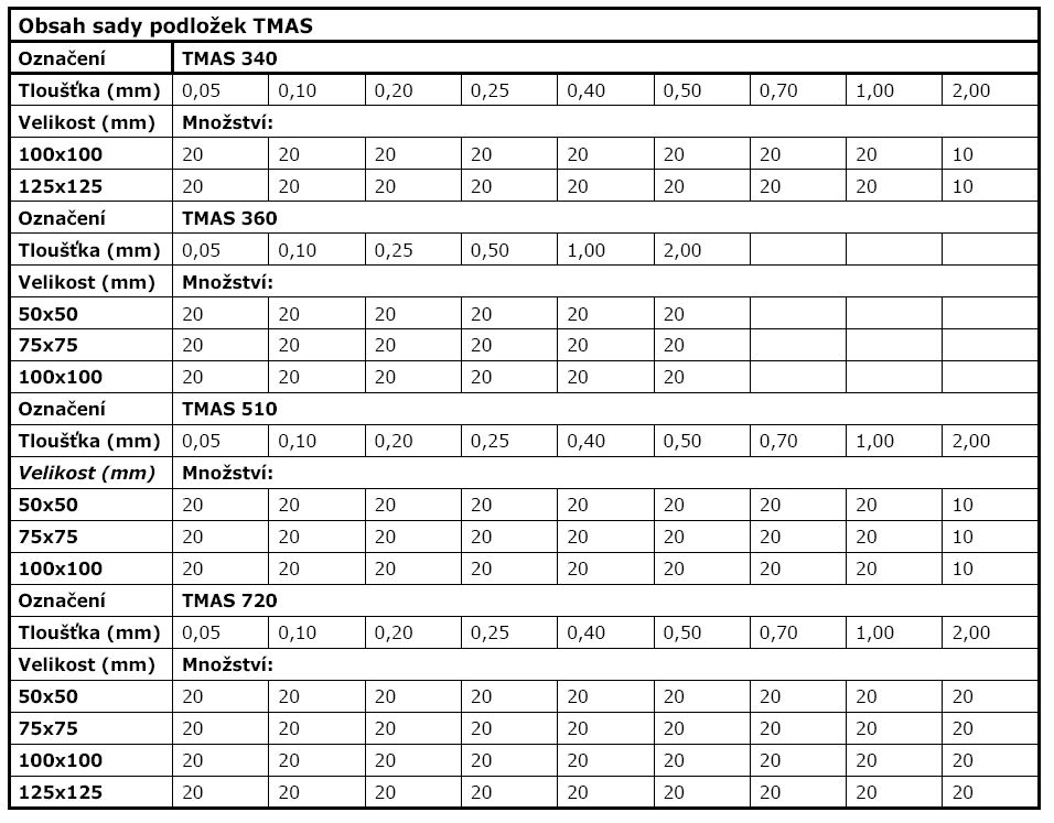 - Přesné podložky jsou dodávány v balení po 10 kusech i v úplných sadách