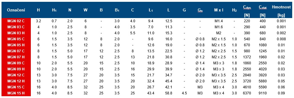 Lineární vedení HIWIN řady MGN vychází z ověřené technologie HIWIN. Gotický profil vodící kuličkové dráhy pohlcuje síly ze všech směrů, je zvlášť pevný a zajišťuje vysokou přesnost. Kompaktní provedení s nízkou hmotností je zvlášť vhodné pro malá zařízení.