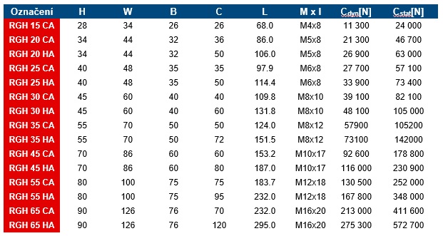 Lineární vedení HIWIN řady RG používá jako nositele valivého pohybu válečky a vyznačuje se mimořádně vysokou tuhostí a velmi dobrou únosností. Je navrženo s kontaktním úhlem 45°. Jeho lineární kontaktní plochy značně snižují deformace od zátěže a zajišťují tak vysokou tuhost a únosnost ve všech čtyřech směrech zatížení. Proto je lineární vedení řady RG ideální pro přesné strojírenství.