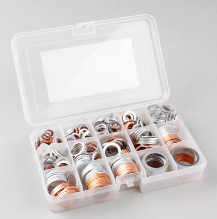 Sada obsahuje směs podložek z mědi v různých rozměrech.