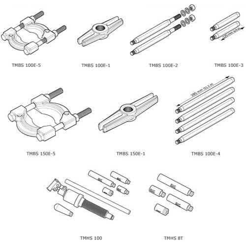 - SKF TMBS 100E a SKF TMBS 150E jsou dodávány s prodlužovacími tyčemi, s nimiž lze stahovák snadno přizpůsobit stahovacím délkám až 816 mm