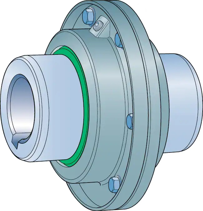 Pružné spojky s vinutou lineární pružinou - svisle dělený kryt Úplná spojka se skládá ze 2 nábojů, 1 lineární vinuté pružiny a 1 krytu.